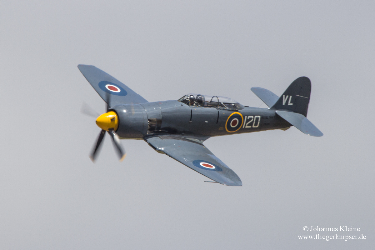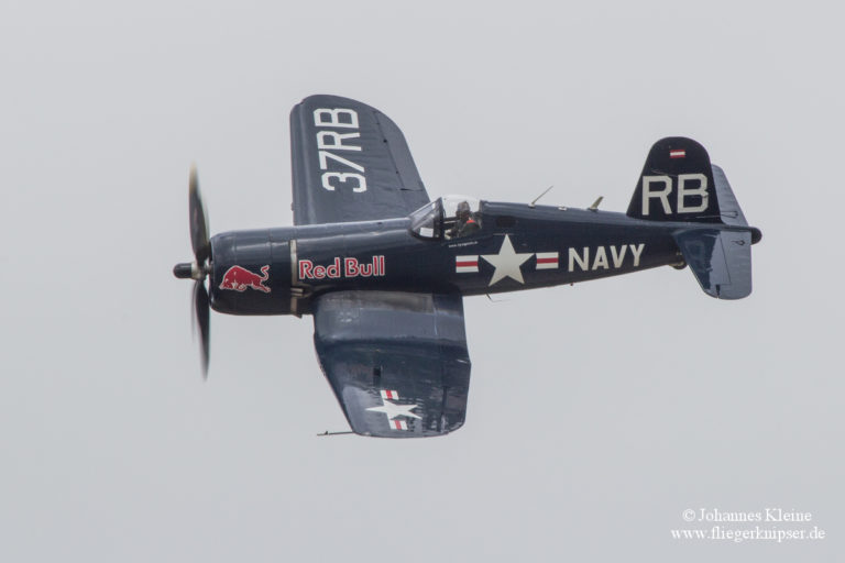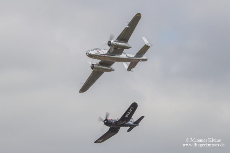 Als weitere Oldtimerflugzeuge bevölkerten eine Hawker Sea Fury, eine Gloster Meteor und PBY Catalina den Himmel. Auch eine Abordnung der Flying Bulls aus Salzburg war über den Kanal gekommen: Die B-25J Mitchell und F4U-4 Corsair zeigten in Formation und solo ihr Können.