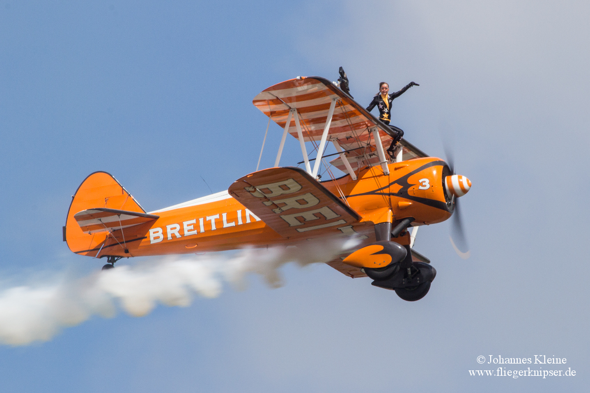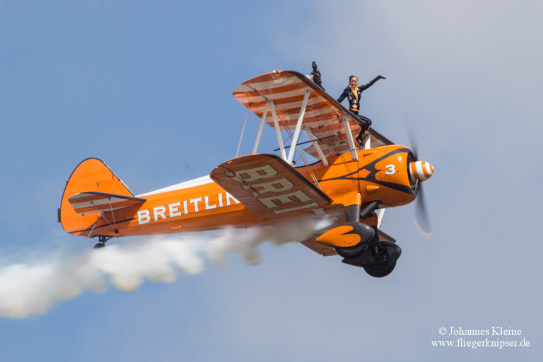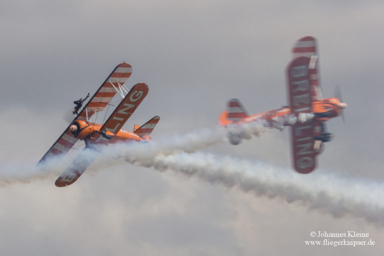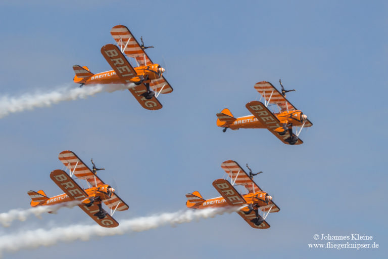 Nicht nur eine Augen-, sondern auch eine Ohrenweide ist das Display der Breitling Wingwalkers. Mit ihren 4 Boeing Stearman Model 75 zeigt das Team allerfeinsten Formationskunsflug mit 4 klassischen Doppeldeckern.