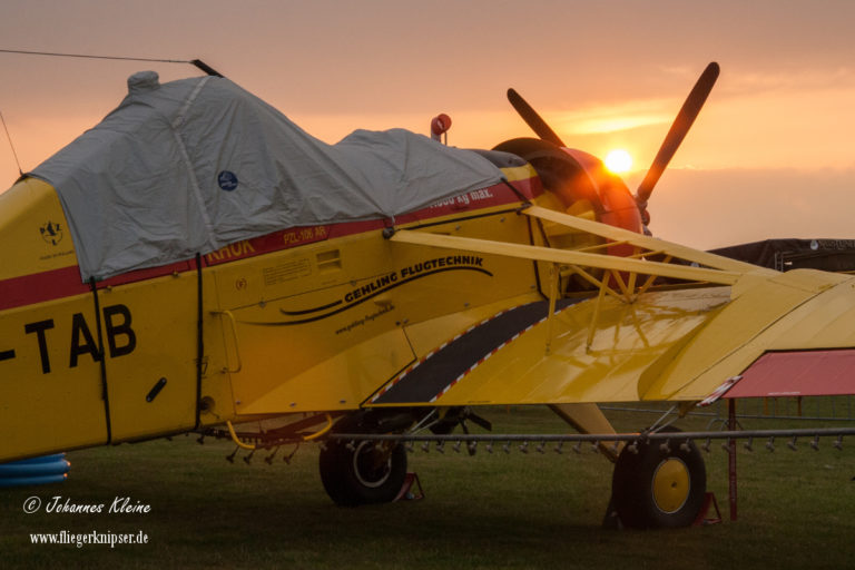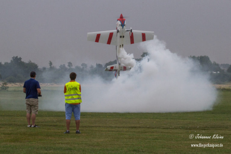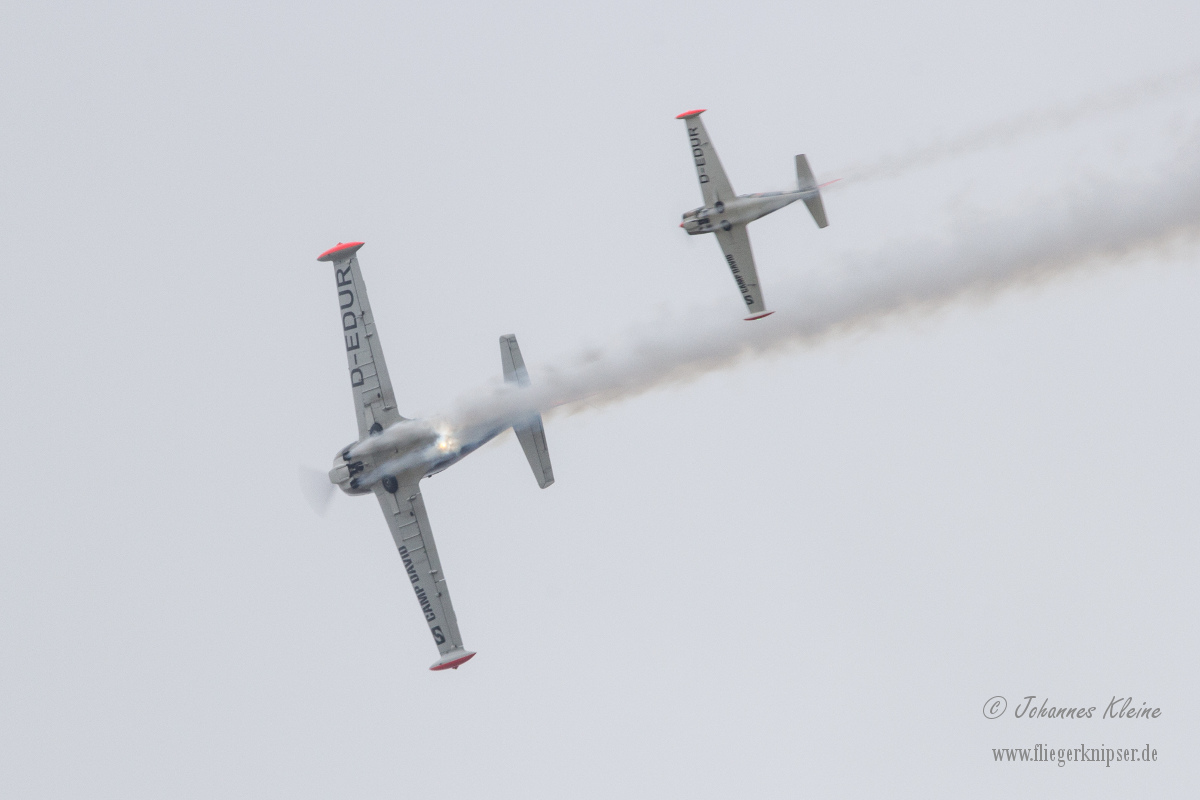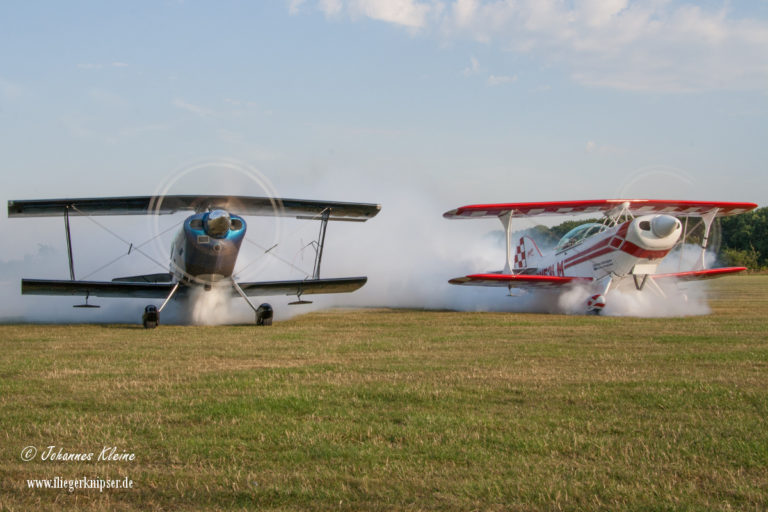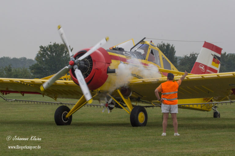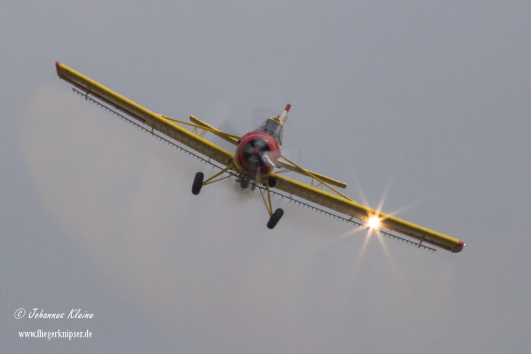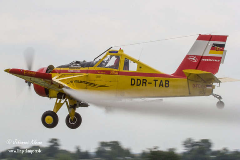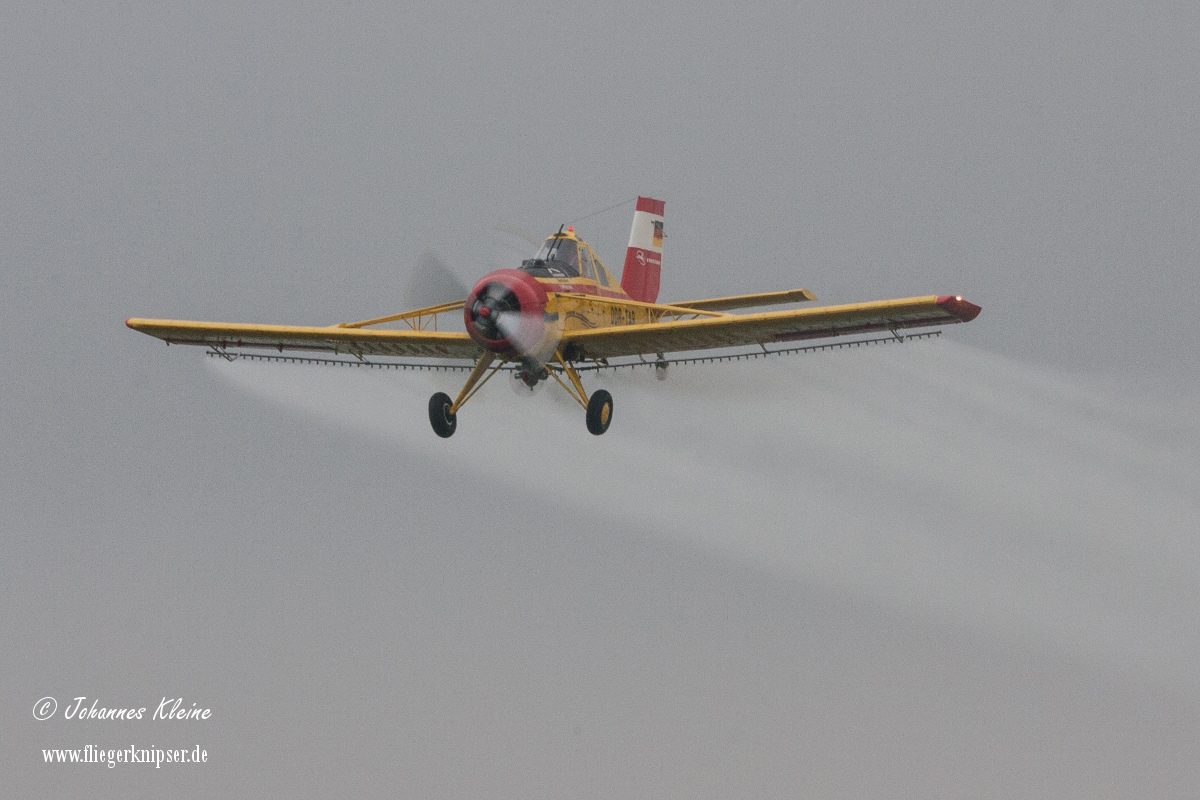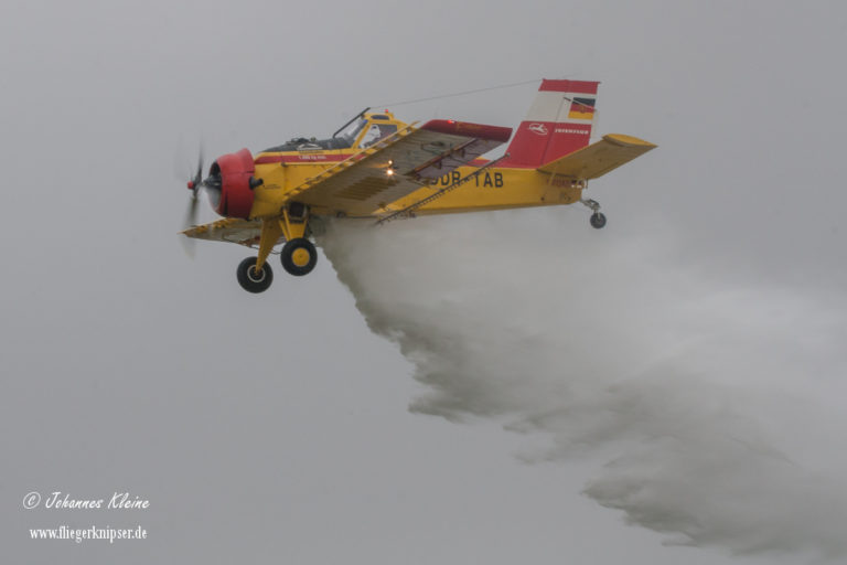 Das Programm gestaltete sich daher am Samstag schwierig, aber immerhin sorgte Dieter Gehling mit seiner PZL 106 „Kruk“ für einen sehenswerten Auftritt während der Sprühvorführung. Er bot ein imposantes Bild am Himmel, denn man traut dem plump und schwerfällig aussehenden Flugzeug die gezeigte Wendigkeit kaum zu.