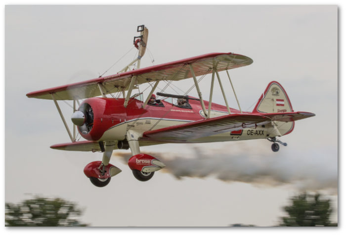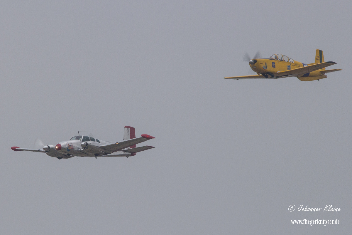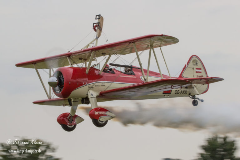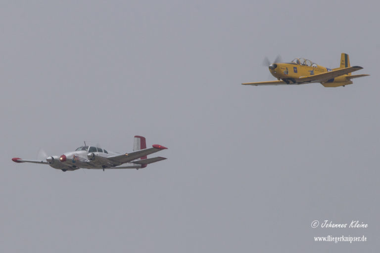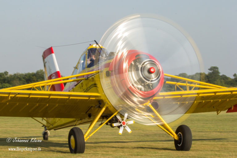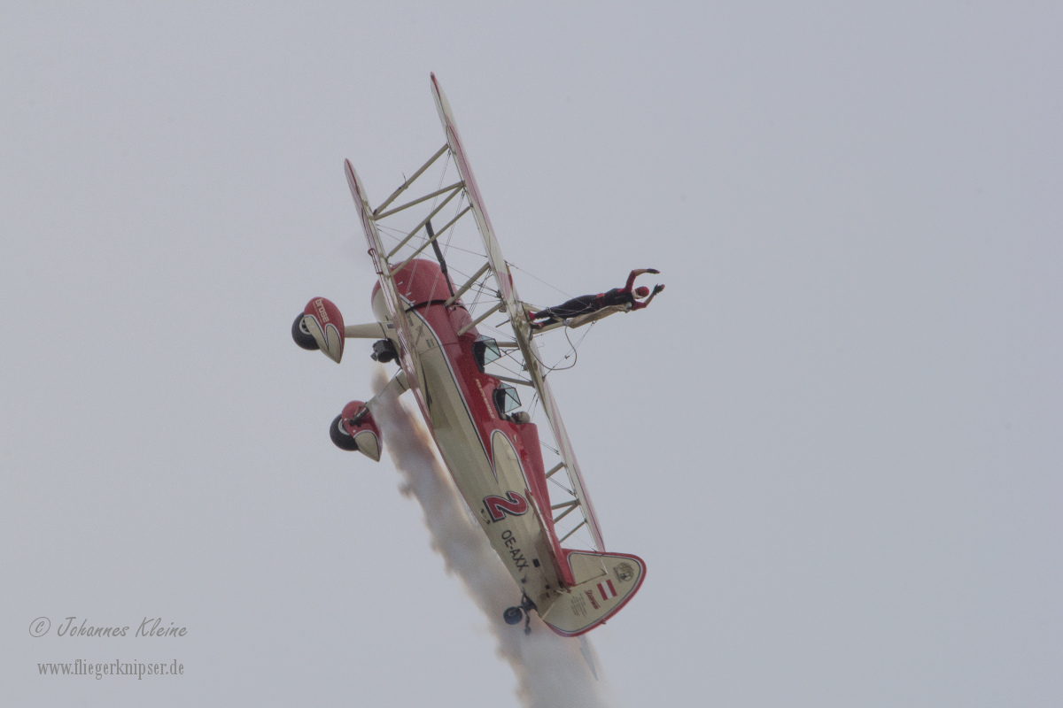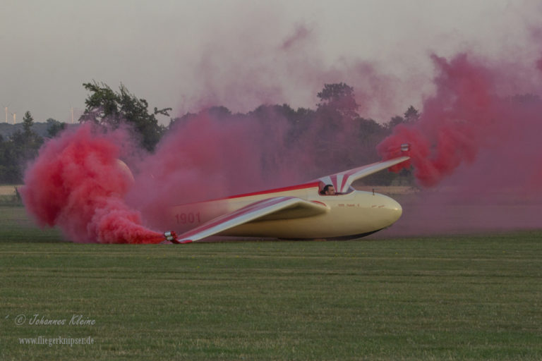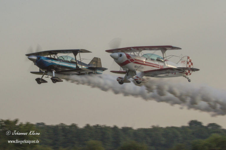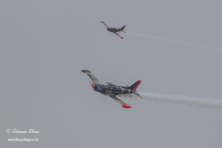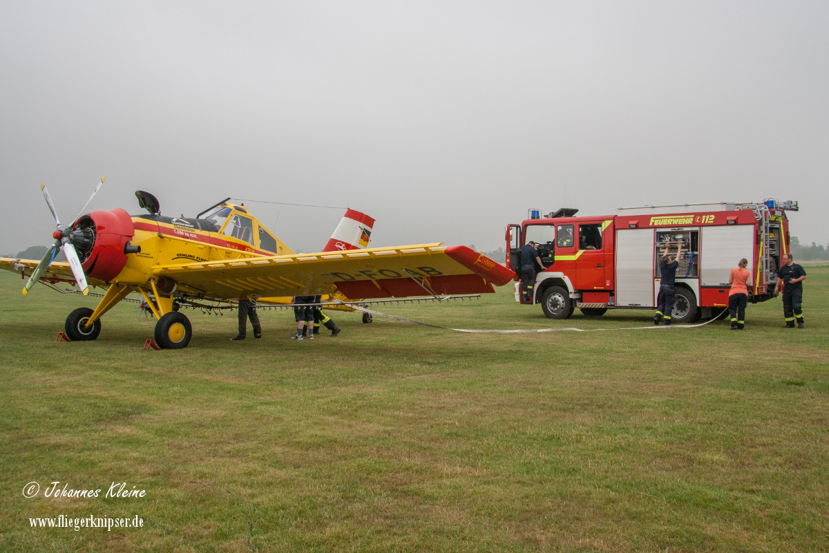 Das Programm gestaltete sich daher am Samstag schwierig, aber immerhin sorgte Dieter Gehling mit seiner PZL 106 „Kruk“ für einen sehenswerten Auftritt während der Sprühvorführung. Er bot ein imposantes Bild am Himmel, denn man traut dem plump und schwerfällig aussehenden Flugzeug die gezeigte Wendigkeit kaum zu.