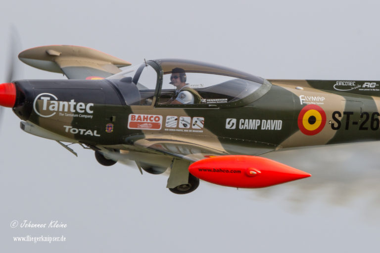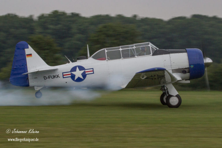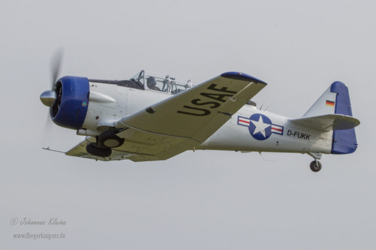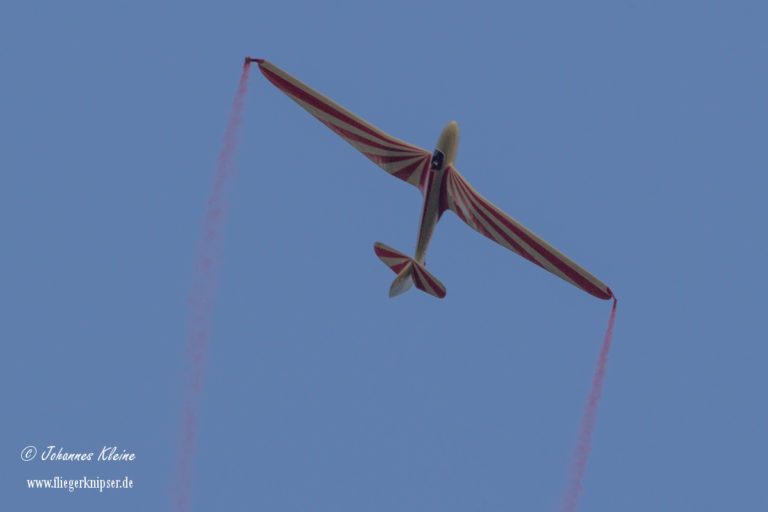 Nicht weniger leise stieg Jürgen Kraus mit seiner 600PS starken AT-6 auf. Schwungvoller und sehr hörenswerter Kunstflug mit diesem Trainer aus den 1950er Jahren waren das Ergebnis.