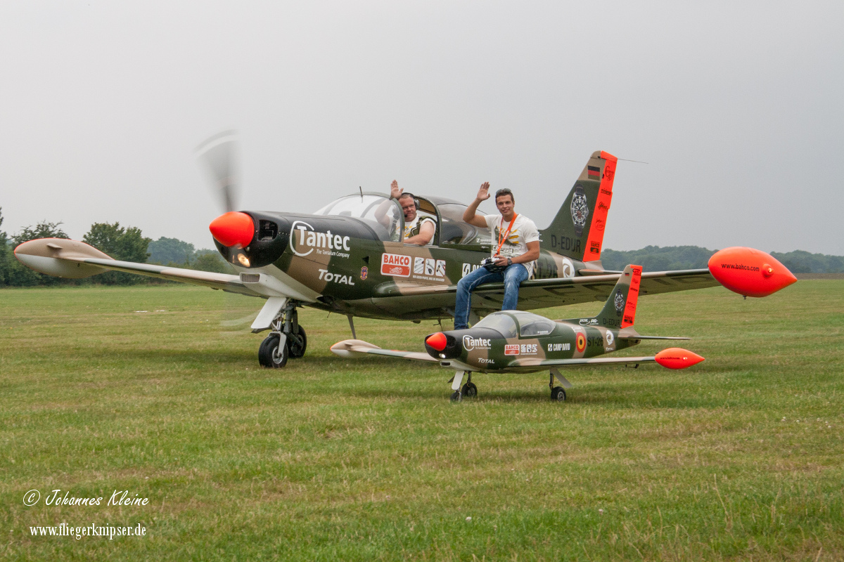 Auch mit von der Partie waren Nico und Ralf Niebergall. Beide sind inzwischen bestens auf Flugtagen bekannt und verblüfften auch in Soest das Publikum durch den Formationskunstflug von Vater Ralf in der „großen“, und Sohn Nico am RC-Steuer der kleinen Siai Marchetti SF260.