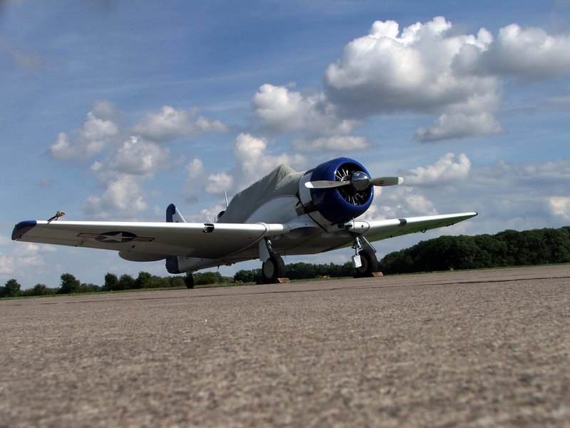 Aufgrund ihrer Größe wirkt sie zunächst etwas steif und schwerfällig. Das dem nicht so ist beweist die T-6 allerdings in der Luft! Dieses Muster ist eine von Canadian Car Foundry 1951 gebaute Harvard MK IV. Zunächst flog sie bei der kanadischen Luftwaffe und war nach dem aktiven Dienst dort, bis 1967, in den Händen mehrerer Privatbesitzer. 1995 schließlich holte sie Jürgen Kraus nach Deutschland und restaurierte sie auf´s gründlichste. 1999 fand der (erneute) Erstflug statt und seitdem ist die T-6 am Flugplatz Aachen-Merzbrück stationiert.