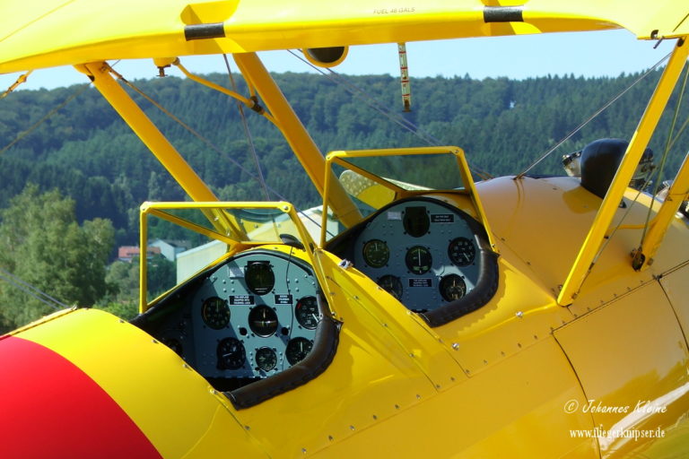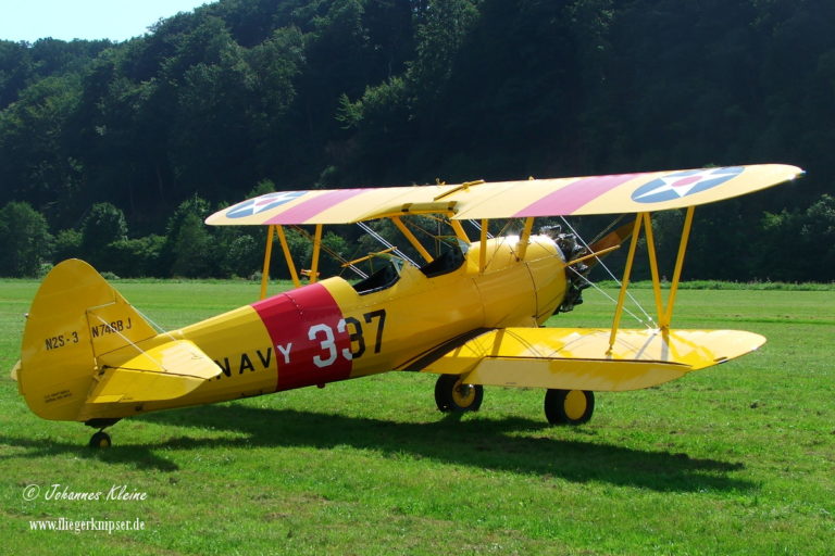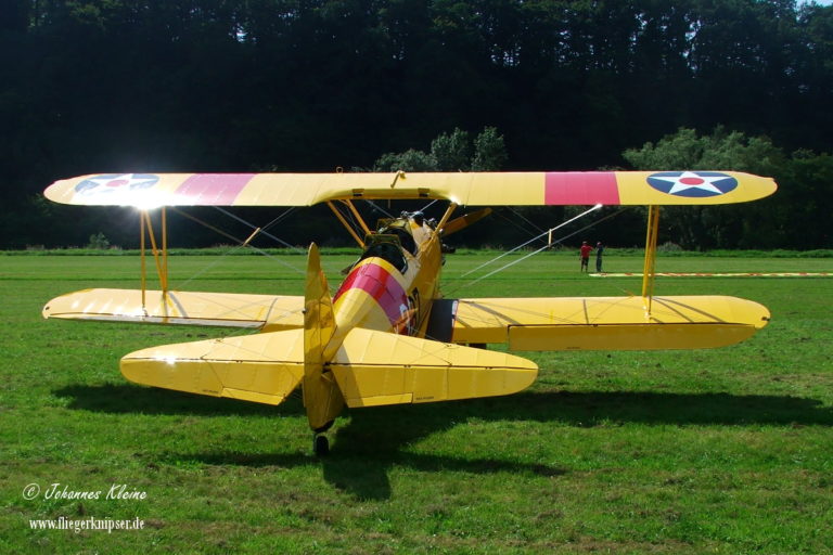 Es handelte sich dabei um die als N746BJ zugelassene Stearman vom Flugplatz Nordhorn-Klausheide aus dem Jahr 1941. Dieser klassische Doppeldecker ist insgesamt in mehreren tausend Exemplaren gebaut worden und diente amerikanischen Militärpiloten der 1930er und 40er Jahren als Grundlagentrainer. Daher stammt auch die geläufige Typenbezeichnung PT13, wobei das Buchstabenkürzel für Primary Trainer steht.