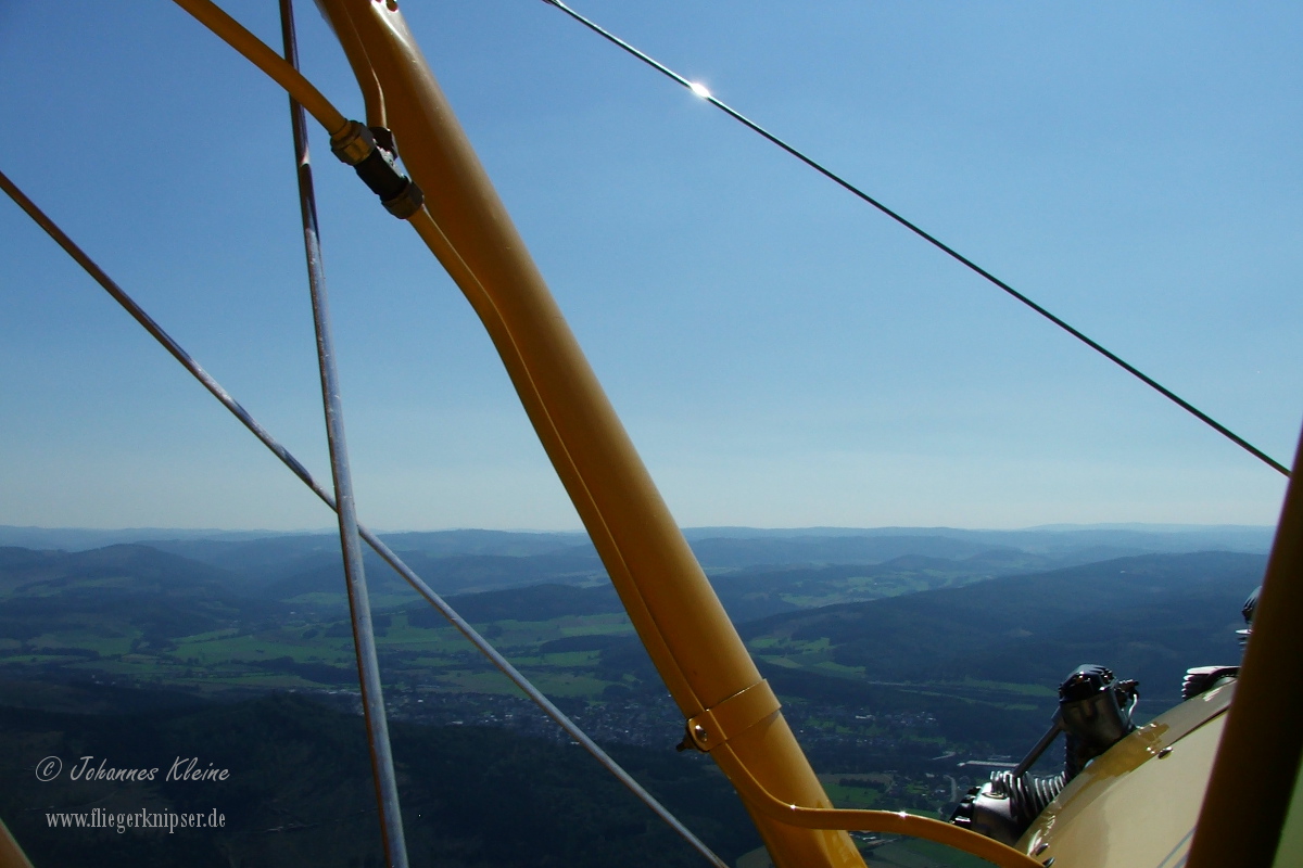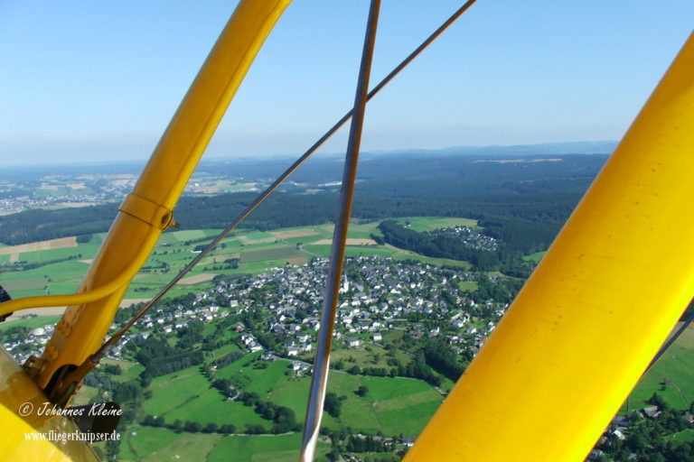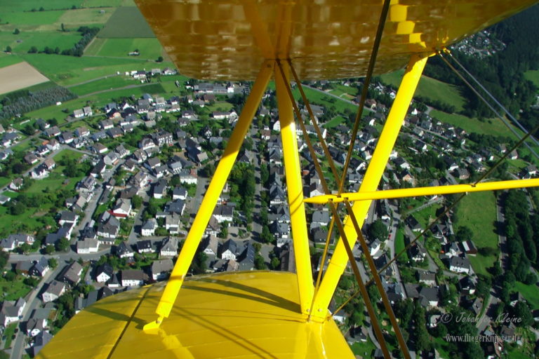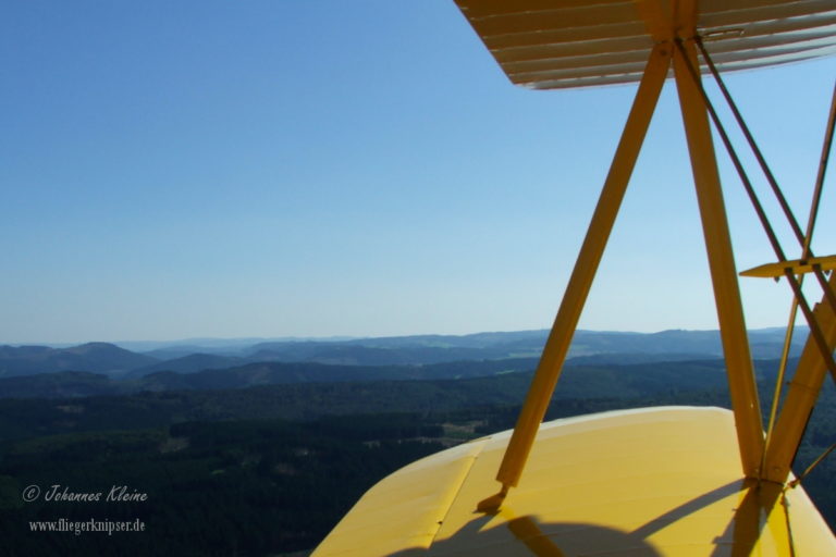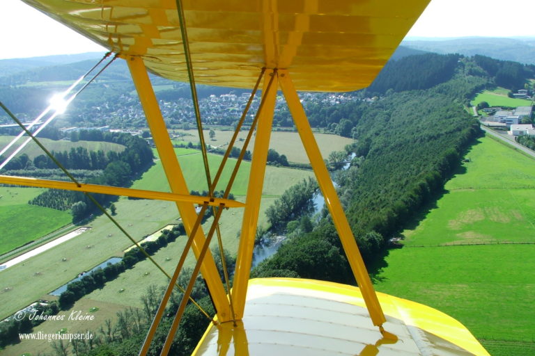 Es ist eben dieses Gefühl, die Vogelperspektive ohne geschlossene Kanzel zu erleben, die Luft und Wiesen zu riechen, den Atem des Flugzeugs zu spüren…. All das macht für mich die Faszination des Doppeldeckerfliegens aus. Man erlebt die Welt von oben, umrahmt von leuchtend gelben Tragflächen, eben gänzlich anders, als man es kennt.