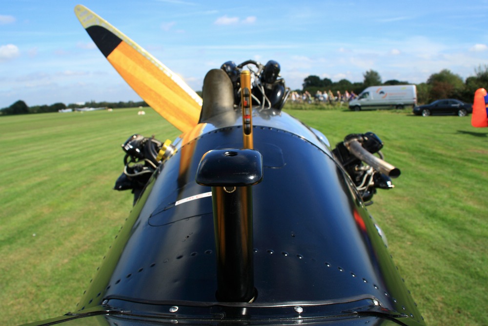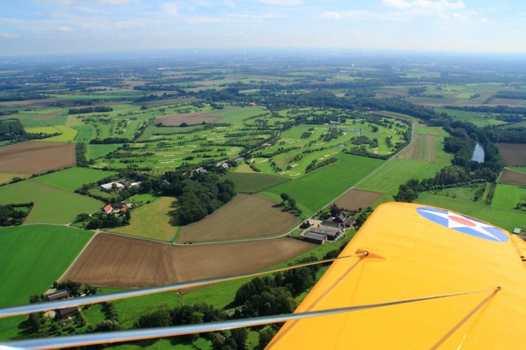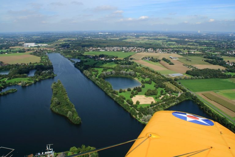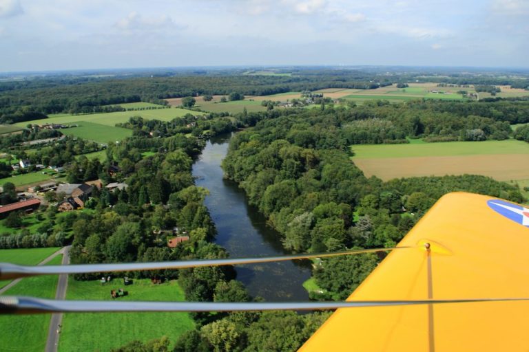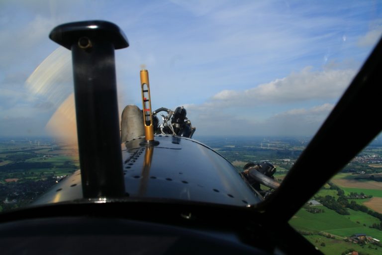 Fliegen bedeutet für mich immer, loszulassen von der Erde. Es ist stets ein Gefühl von Freiheit und tiefer Verbundenheit mit der Natur, der Luft, dem Himmel. Dieser Samstag mit bestem T-Shirt Wetter bestätigte auf´s Neue die Erfahrung, dass das Fliegen in einem offenen Flugzeug dem reinen Freiheitsgefühl am nächsten kommt. Der Sternmotor schnattert mit nahezu stoischer Unbeirrtheit vor den eigenen Füßen, die leuchtend gelben Flächen schweben über Wiesen, Straßen und Flüssen, der Fahrtwind langt hin und wieder in das Cockpit hinein.